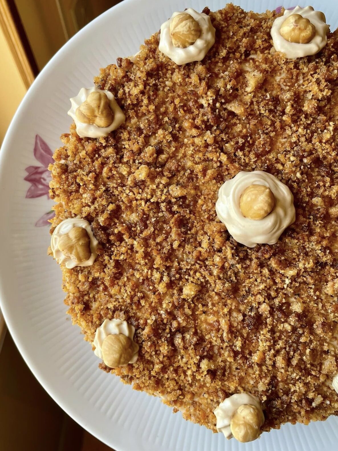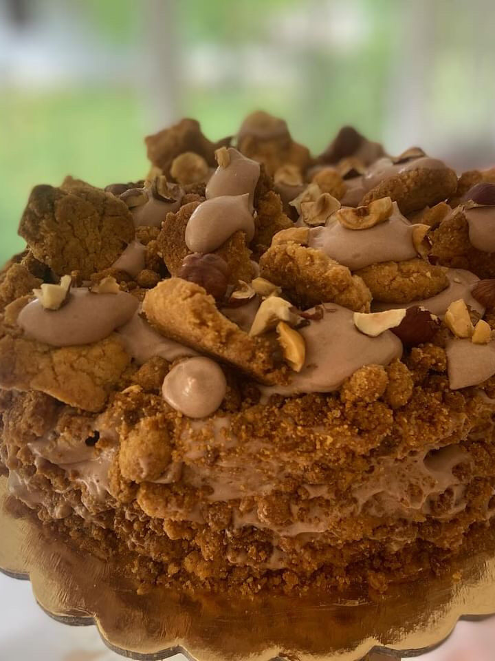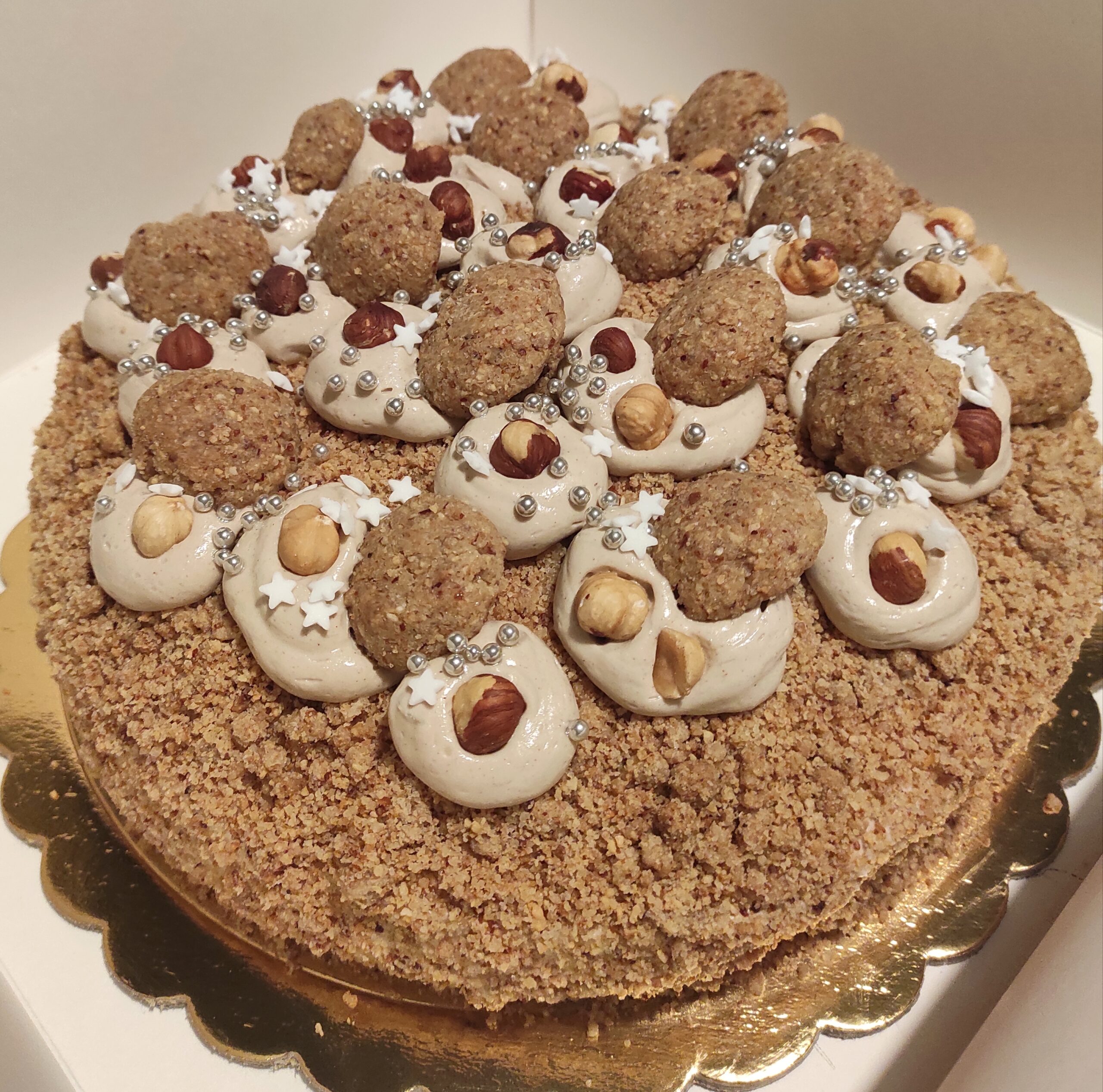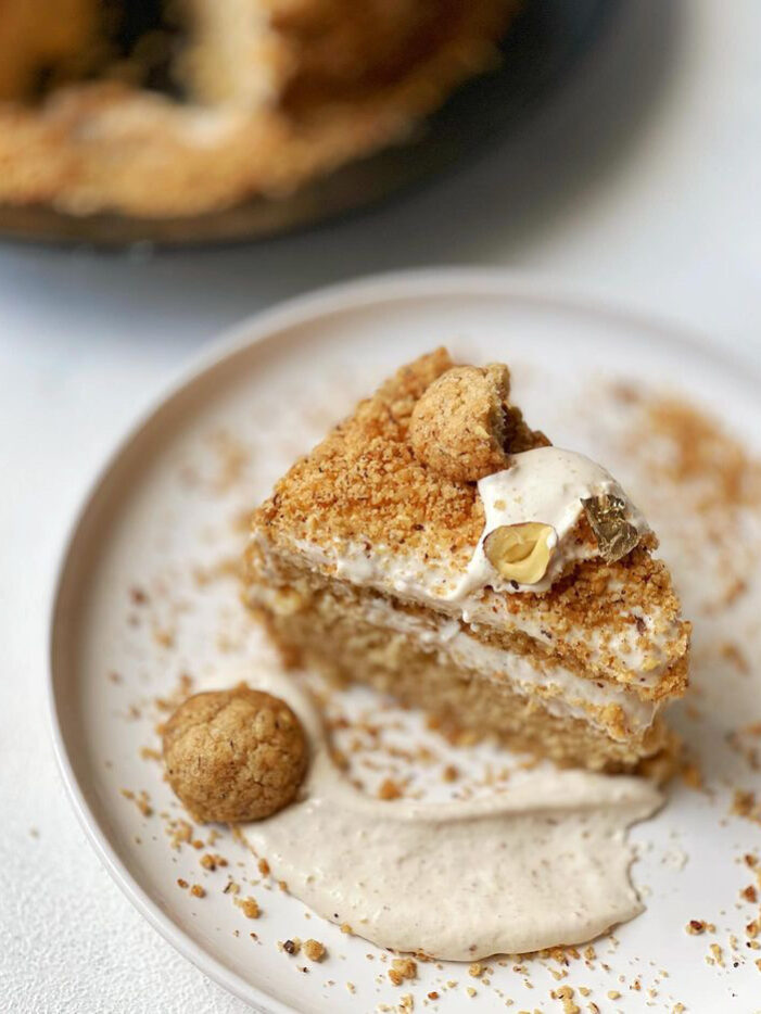 Questa torta è un tripudio di nocciola, super golosa, abbiamo una sponge che potete decidere se fare con o senza glutine, farcita con una crema diplomatica alla nocciola, e quindi una crema leggera, spumosa, che ricopre anche tutta la torta esternamente. Abbiamo poi un crumble di nocciole che copre tutta la torta, ed infine la decoriamo ri utilizzando queste preparazioni quindi spuntoni di crema, crumble a pezzi più grossi, nocciole tostate e foglie d’oro edibili.